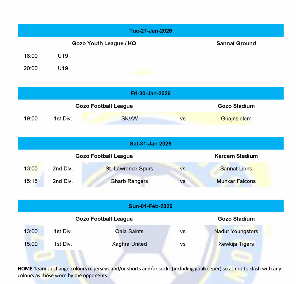 29 March 2026 GFA BOV Gozo Football League 2nd Division (MD 15) Kercem Stadium Oratory Youths FC : 0 Sannat Lions FC : 6 35’ (0-1) Igor Nedeljkovic 42’ (0-2) Igor Nedeljkovic 45’ (0-3) Keiran Calleja 47’ (0-4) Igor Nedeljkovic 67’ (0-5) Igor Nedeljkovic 88’ (0-6)...