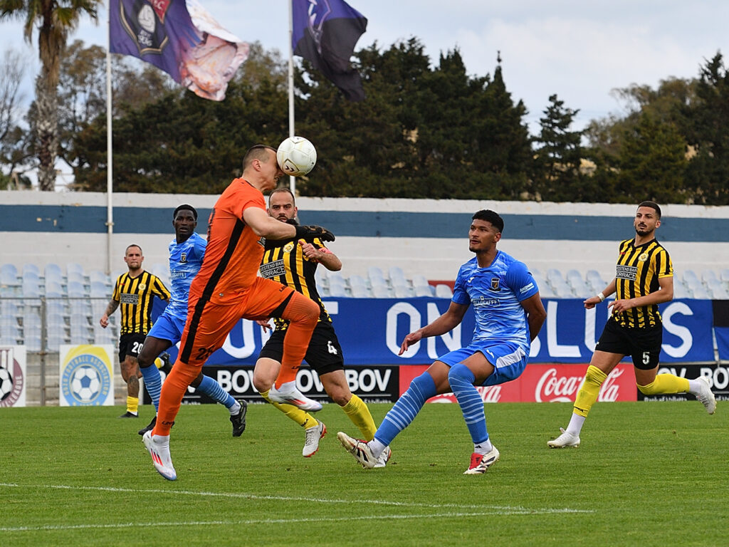 8’ A dangerous cross by Victoria’s substitute Sam Harland forced Manuel Bustos to clear just ahead of Matthias Cordina, preventing a certain goal.