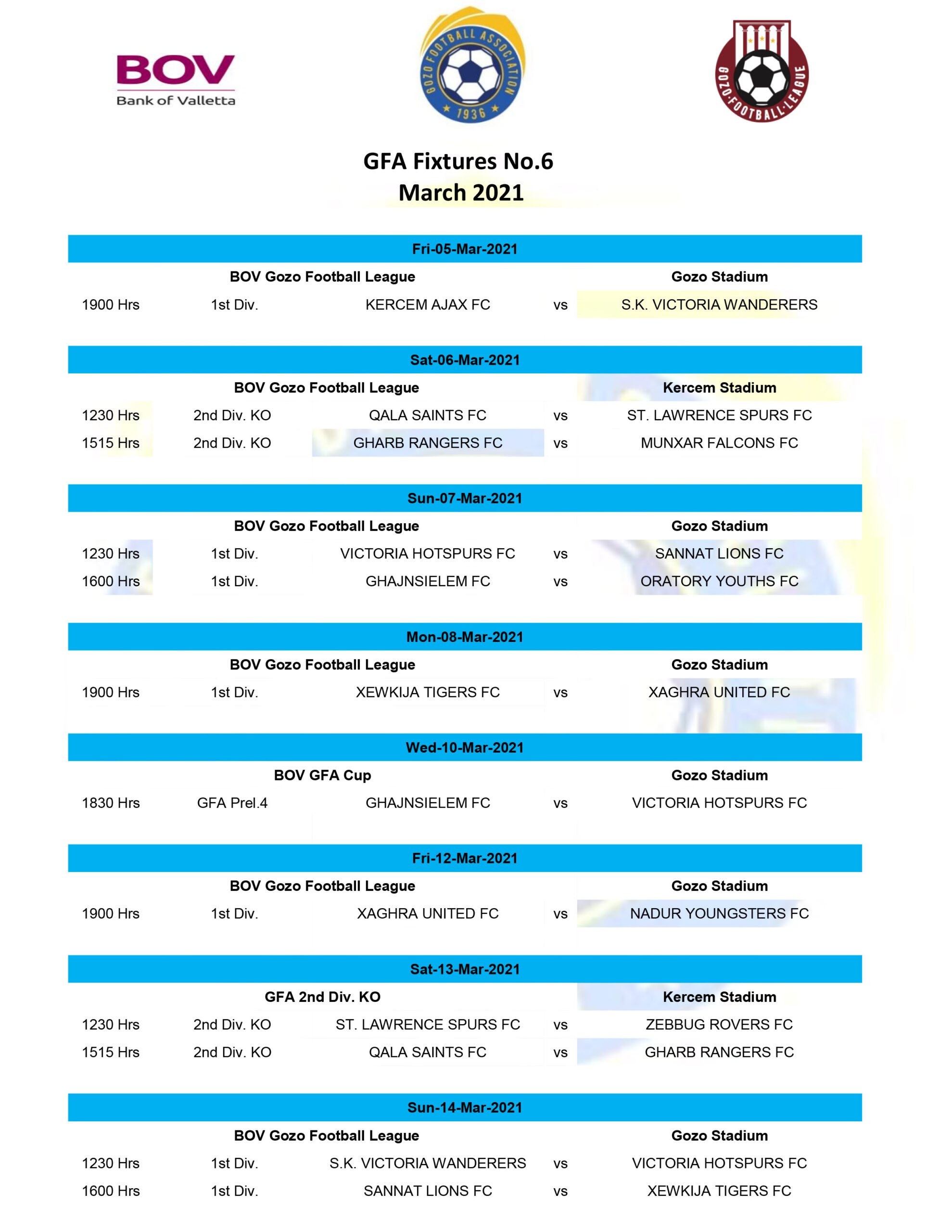 5 March 2021 GFA BOV Gozo Football League Division I – Match Day 10 Gozo Stadium Kercem Ajax FC : 1 SK Victoria Wanderers : 3 36’ (0-1) Aud-Gustine James Obaje 78’ (0-2) Gabriel Cardona 83’ (0-3) Gabriel Cardona 87’ (red card) Neil Camilleri (SKVW) 88’ (1-3) penalty...